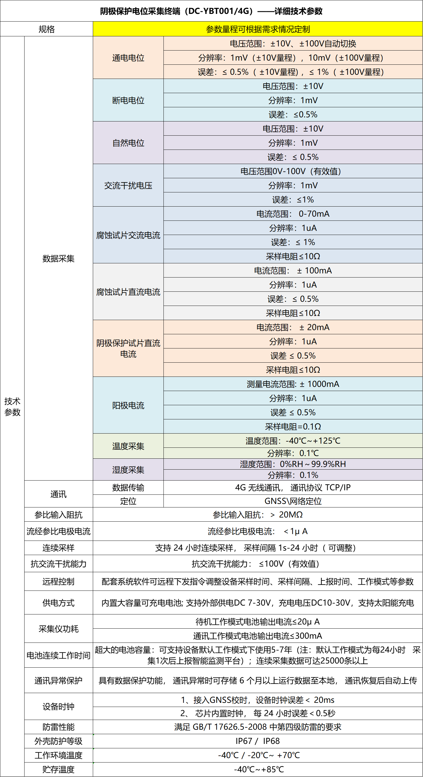 为了满足众多管道阴极保护监测单位的需求,本公司研发的DC-YBT001/4G型智能采集终端系统,依据本行业相关标准规范, 针对管道阴极保护检测参数内容,精心探究用户的应用场景, 最终定型生产出本款优质价廉、便捷长效, 精准稳定的设备终端。本设备应用物联网技术,可实现自动采集,精准测量,自动分析,自动上传,自动云存储,自动报警分析等全自动实时监测。设备待机在低功耗微安级,工作电流在毫安级,内置长效电池,续航工作时间5年以上,而同类产品多数采用光伏电池供电,常因光伏板被盗而失效,或有后备电池,但因设备工作电流较大,续航时间大大缩短。